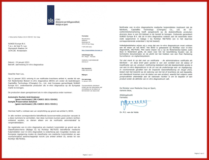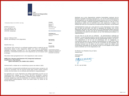 ? ? ? 近日,博奧晶典聯(lián)合清華大學(xué)成功研發(fā)的由新型冠狀病毒2019-nCoV核酸檢測(cè)試劑盒(全集成碟式芯片法),英文名稱:SARS-CoV-2 Nucleic Acid Detection Kit (Integrated Isothermal Amplification Chip Method)和全自動(dòng)核酸分析儀,英文名稱:Automatic Nucleic Acid Analyzer組成的全集成芯片實(shí)驗(yàn)室系統(tǒng)獲CE準(zhǔn)入資質(zhì)(證書號(hào):NL-CA002-2021-55957和NL-CA002-2021-55450),獲CE準(zhǔn)入資質(zhì)表明該產(chǎn)品符合歐盟醫(yī)療器械相關(guān)指令的符合性要求,具備歐盟市場(chǎng)的準(zhǔn)入條件,將為歐洲地區(qū)的新冠疫情防控工作提供高靈敏度全集成快速檢測(cè)工具。