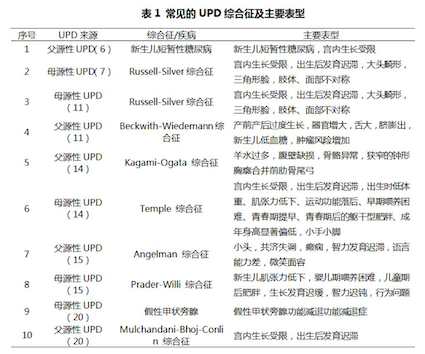 大多數(shù)染色體UPD沒有臨床表型,當UPD發(fā)生在印記基因區(qū)域則會導致印記基因異常,出現(xiàn)異常的表型。目前針對上述UPD綜合征(表1)尚無有效的治療手段,因此,早發(fā)現(xiàn)、早診斷、早干預對于此類疾病的防控尤為重要。