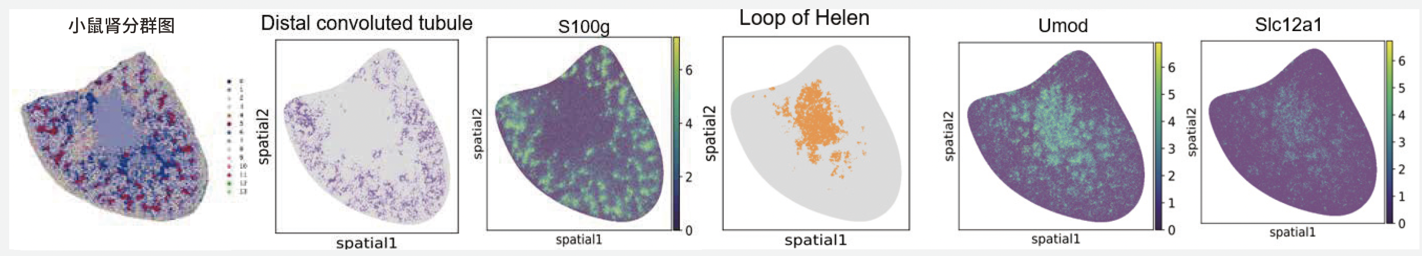 使用博奧晶典高分辨率空間轉(zhuǎn)錄組平臺, 構(gòu)建了小鼠腎的高分辨率空間轉(zhuǎn)錄組圖譜,揭示了腎組織空間分區(qū)結(jié)構(gòu)(圖3)。其次,小鼠腎基因表達(dá)圖譜與HE 染色結(jié)果相結(jié)合可以清晰的了解各細(xì)胞類群的基因表達(dá)及相互作用,揭示它們對疾病發(fā)生、發(fā)展、治療、預(yù)后評估的價值。