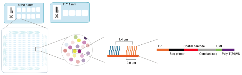 芯片包括兩種類型:組織透化芯片和基因表達(dá)芯片,表達(dá)芯片捕獲區(qū)域面積為11*11mm。在捕獲區(qū)域內(nèi)存在著數(shù)千萬的探針簇,每個探針簇的直徑為0.8 μm,每平方微米有約18000 條探針,用于捕獲轉(zhuǎn)錄本(圖1)。每條探針捕獲序列由5 部分組成 :